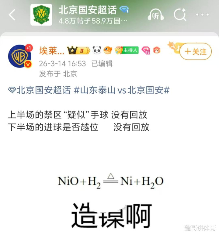 这位北京大V写到:上半场禁区里的疑似手球莫得回放,下半场的进球是否越位,莫得回放,配上了一个化学方式式,当这2种分子遇到一齐发生化学响应生成的物资是镊后,也疑似暗讽了北京国安客场遇到到非平日判罚的原因,即是裁判加泰山队的主场上风,最终产生了新的化学物资—造镊。