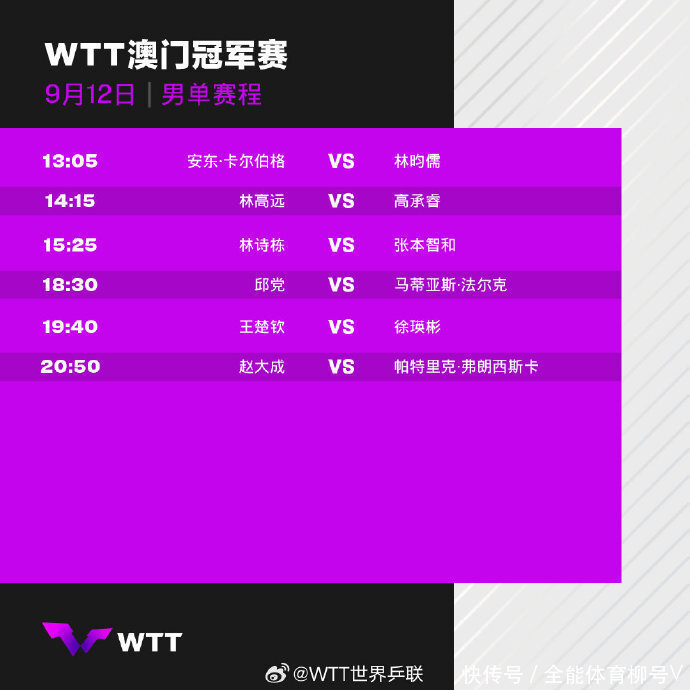 男人单打1/8决赛具体对阵和比赛时候为:安东-卡尔伯格VS林昀儒(13:05)、林高远VS高承睿(14:15)、林诗栋VS张本智和(15:25)、邱党VS法尔克(18:30)、王楚钦VS徐瑛彬(19:40)、赵大成VS弗朗西斯卡(20:50)体育录像/图片。期待王楚钦、林诗栋、林高庞杂略延续联袂晋级。