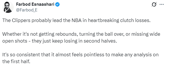 快船惨遭18分逆转,快船随队记者Farbod Esnaashari诱骗品评球队:“快船队在要道工夫惨痛失利数可能是定约第一。无论是篮板球争抢不力、特别过多,如故错失空位投篮契机,他们不才半场老是不停输球。这种情况如斯庸碌,甚至于分析上半场的表露似乎变得毫无真谛真谛。”