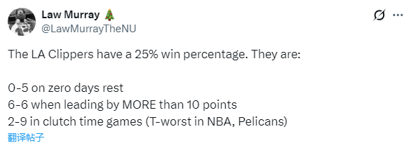 最近8场比赛,快船输掉7场,战绩变为6胜18负,又掉到西部倒数第二位,,战绩仅好于鹈鹕(3胜21负);据快船记者Law Murray统计,本赛季快船背靠背第二天的比赛0胜5负;提升10分的比赛6胜6负;要道工夫(终末5分钟分差5分以内)的比赛2胜9负,和鹈鹕比肩定约最差。
